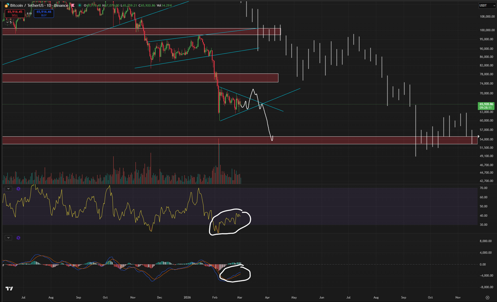 “MACD/RSI completely resetting for another move lower. Still eyeing 52k area,” he told X followers.