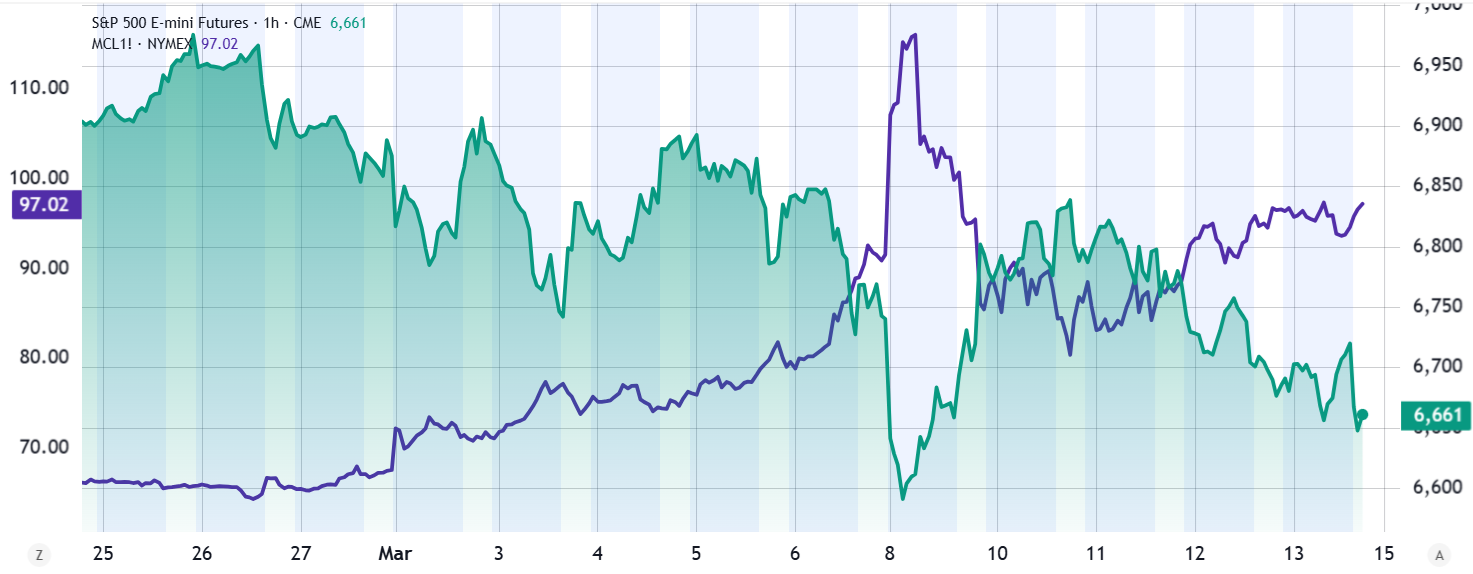 WTI oil futures (left) vs. S&P 500 futures (right). Source: TradingView
