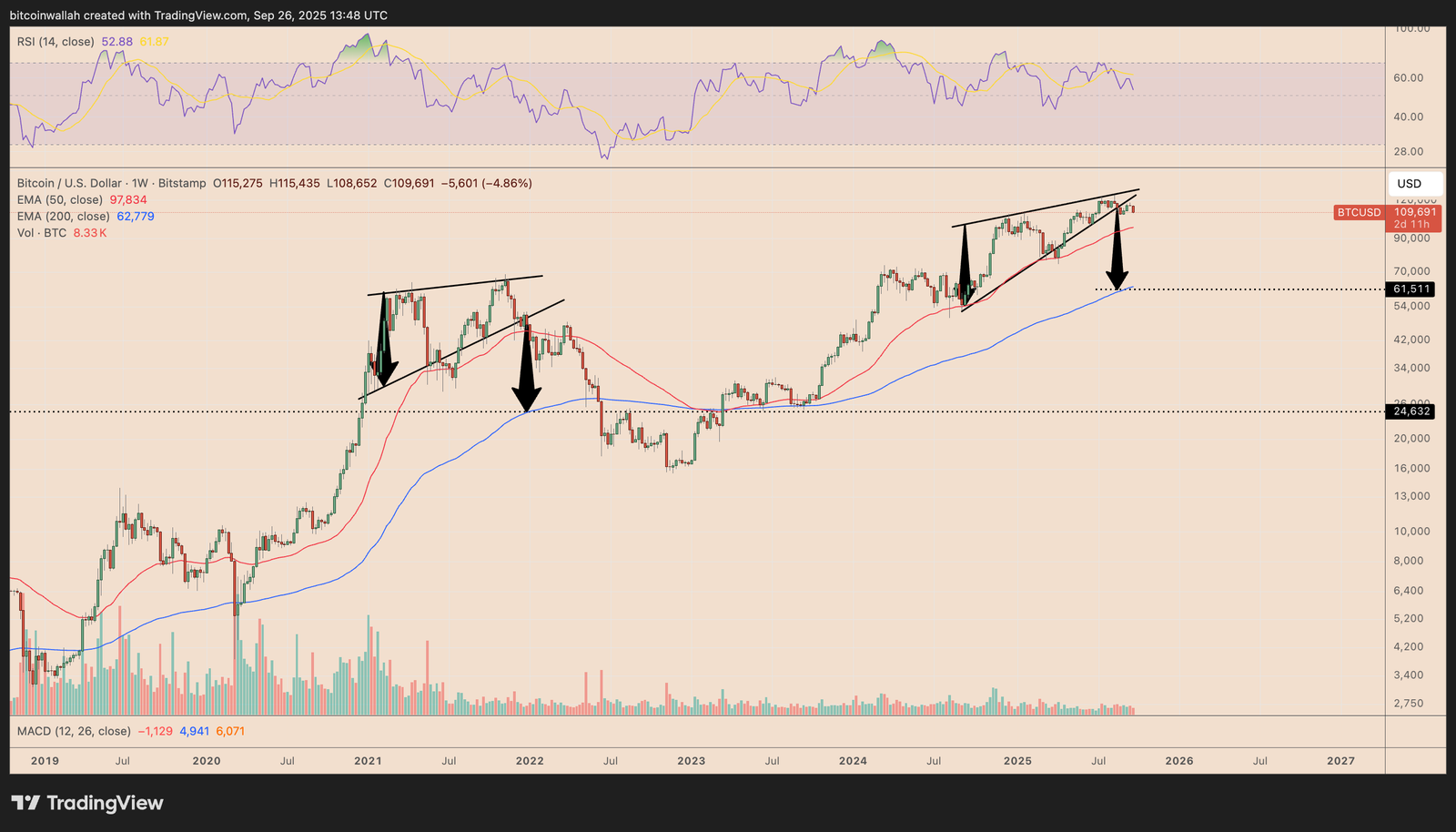 Notably, a similar wedge collapse in 2021 triggered a 55% correction down to the same 200-week EMA support.