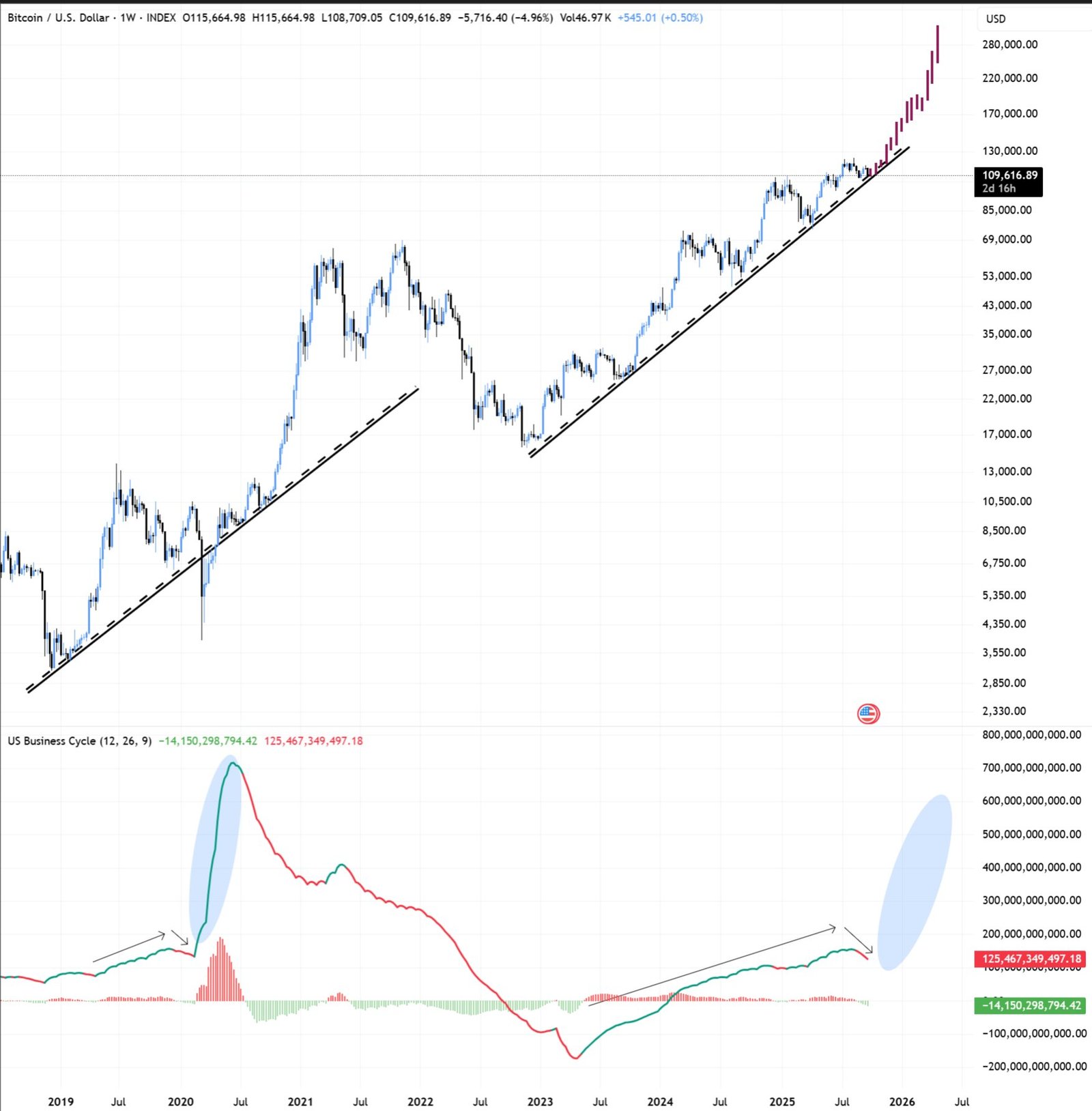 Analyst Bitbull says that Bitcoin is still far from a true cycle top, pointing out that the US Business Cycle, a broad gauge of economic momentum, hasn’t peaked yet, which usually happens before markets roll over.