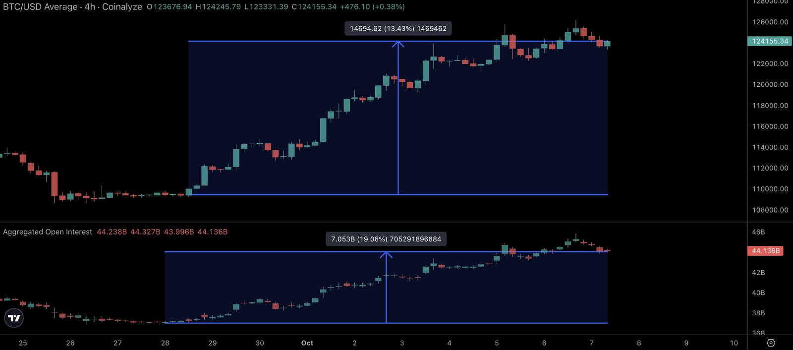 “$7B of OI got added which is about +19% of global OI added. This is not entirely in line with the price which is up +13% during this timeframe. Safe to assume there’s been quite a bit of chasing by longs, especially since the $120K+ break,” part of an X post read.