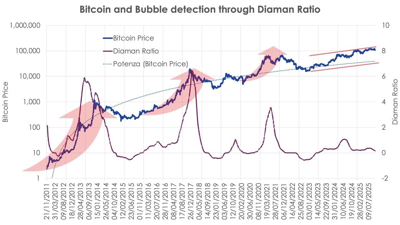 On four occasions, Bitcoin can be considered to be in a “bubble” phase, i.e., with more than exponential returns, but unlike traditional bubbles that then burst in a few months, Bitcoin has shown resilience in its growth, which on average has a Diaman Ratio of less than 1 with high but not exponential growth. In fact, a power law can describe the growth of Bitcoin’s price very well.