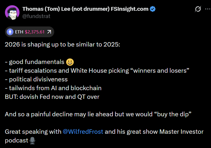 Despite earlier optimism for the end of 2025, Tom Lee has warned that conditions have shifted, with 2026 likely starting on a “painful” note before any potential rebound later in the year.