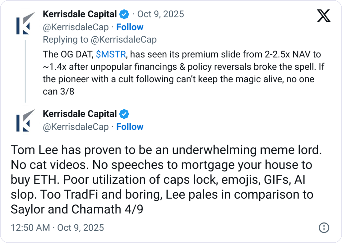 It said that BitMine’s $365 million share offering in late September was “a discounted giveaway” and argued the deal was “a cleverly packaged dilutive raise that sacrificed long-term credibility for short-term cash.”