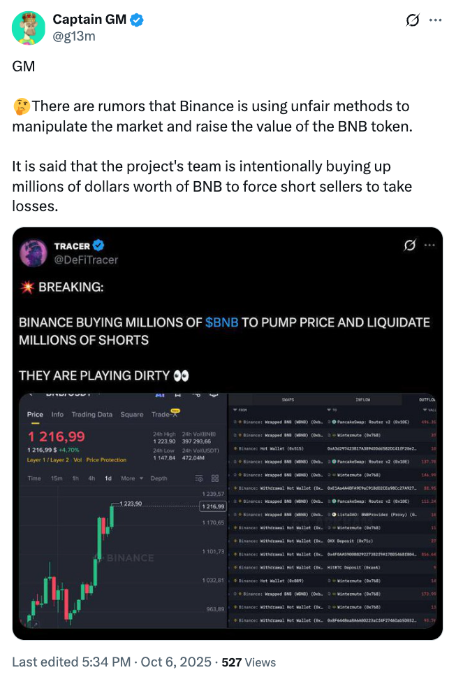 Manipulation allegations have also circulated on X, where DeFiTracer accused Binance of “buying millions of BNB to liquidate shorts,” suggesting the exchange may be actively driving price movements for BNB.