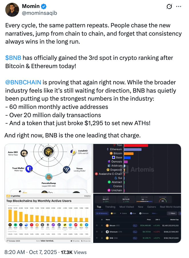CZ took to X on Tuesday to post “Keep building on BNB Chain,” while the official BNB Chain account reposted analysis by BNB-focused crypto enthusiast Momin Saqib.