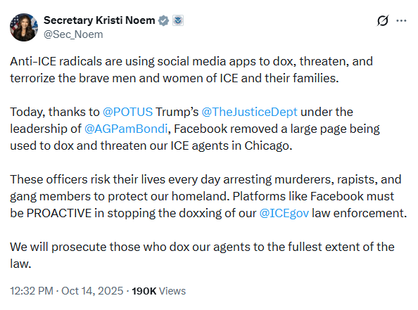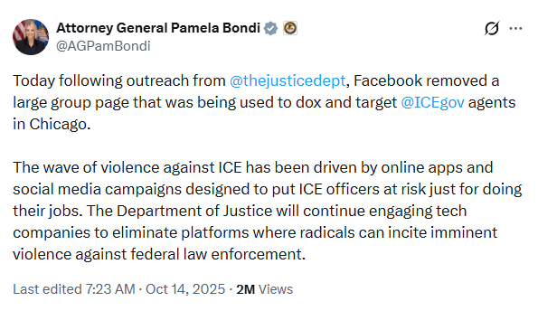 Today, thanks to @POTUS Trump’s @TheJusticeDept under the leadership of @AGPamBondi, Facebook removed a large page being used to dox and threaten our ICE agents in Chicago.