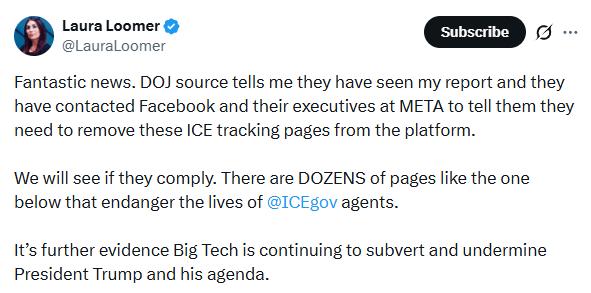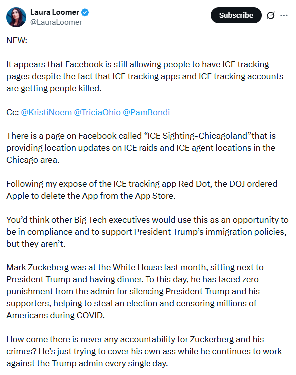 Then, on October 12, 2025, Laura Loomer tagged Noem and Bondi in a social media post flagging the group. Loomer’s role here deserves a moment of appreciation. This is a person who sued Facebook, claiming it was literally RICO to moderate her posts. Who sued all the major tech companies, arguing that content moderation violated her First Amendment rights. Her entire public identity has been built on the premise that private platforms moderating her speech is unconstitutional censorship.