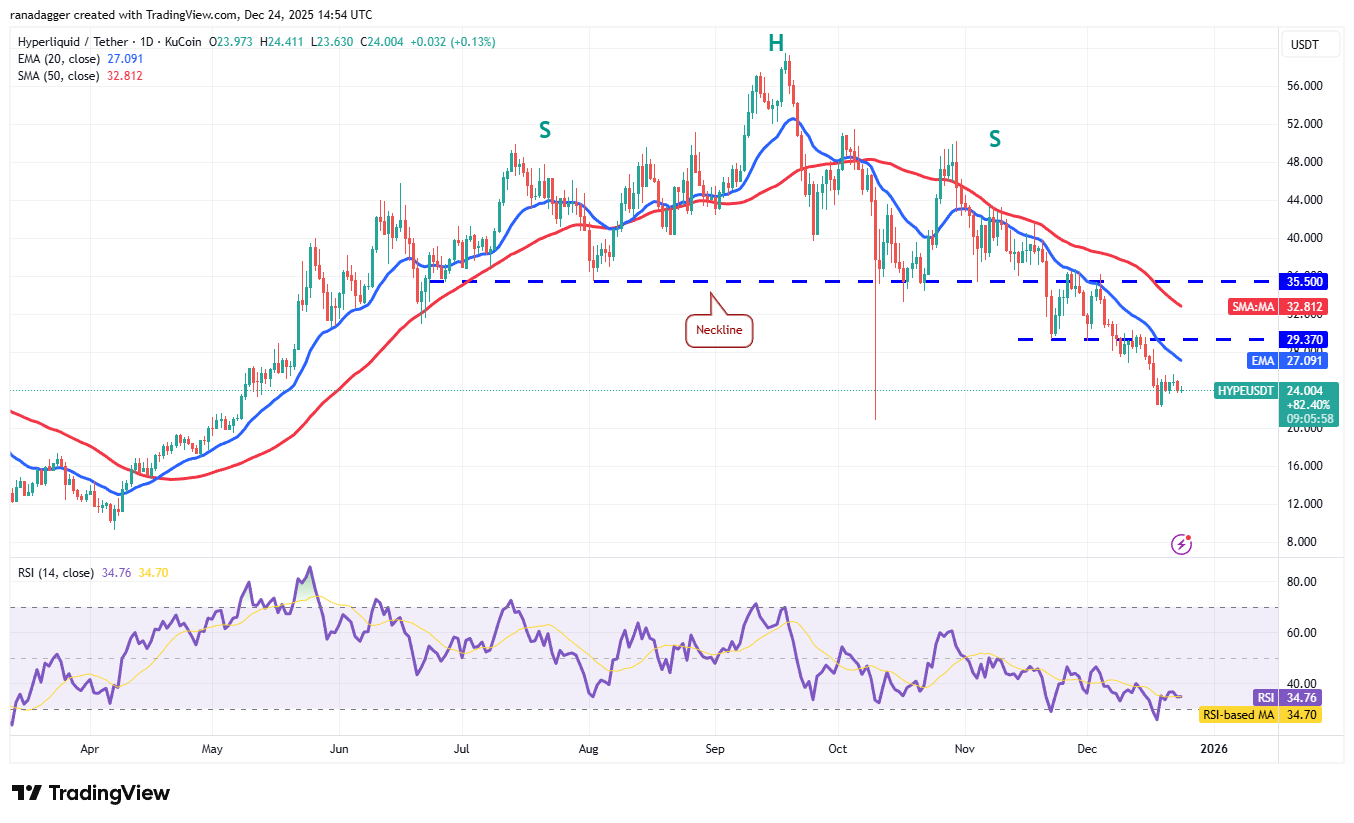 Hyperliquid’s (HYPE) bounce could not even reach the 20-day EMA ($27.09), indicating a lack of demand from the bulls at higher levels.