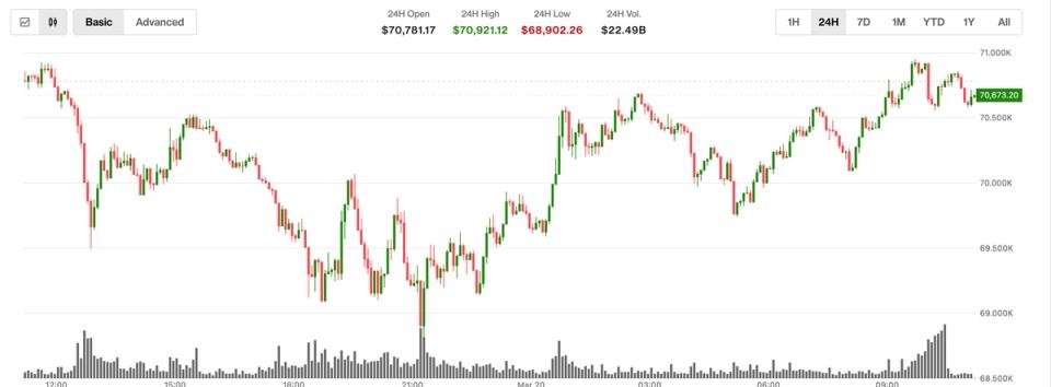BTC, the largest cryptocurrency, jumped to $70,800, up more than 1% on the day, extending its recovery from overnight lows under $68,900, according to CoinDesk data. Other major coins, including ether (ETH), XRP (XRP), and solana (SOL), saw smaller gains of less than 1%, lagging behind bitcoin.