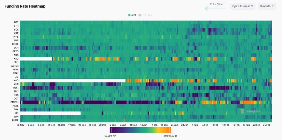 Measuring open interest in BTC terms removes the distortion caused by price swings. Rising open interest alongside negative funding suggests growing participation, with an increasing share of traders positioned for further downside.