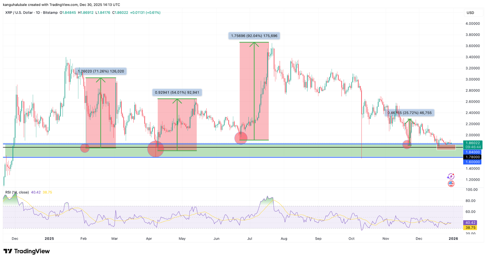 XRP’s recent drawdown was stopped by buyer congestion from a key demand zone between $1.60 and $1.84, which has supported the price throughout 2025.