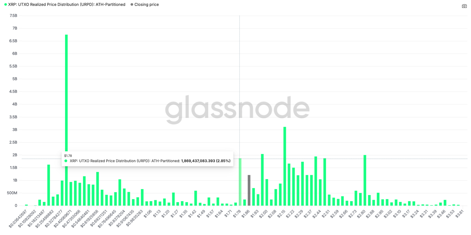 Glassnode’s UTXO realized price distribution (URPD), which shows the prices at which the current supply was created, indicates that $1.78 is the most significant support for XRP, where investors acquired 1.87 billion tokens.