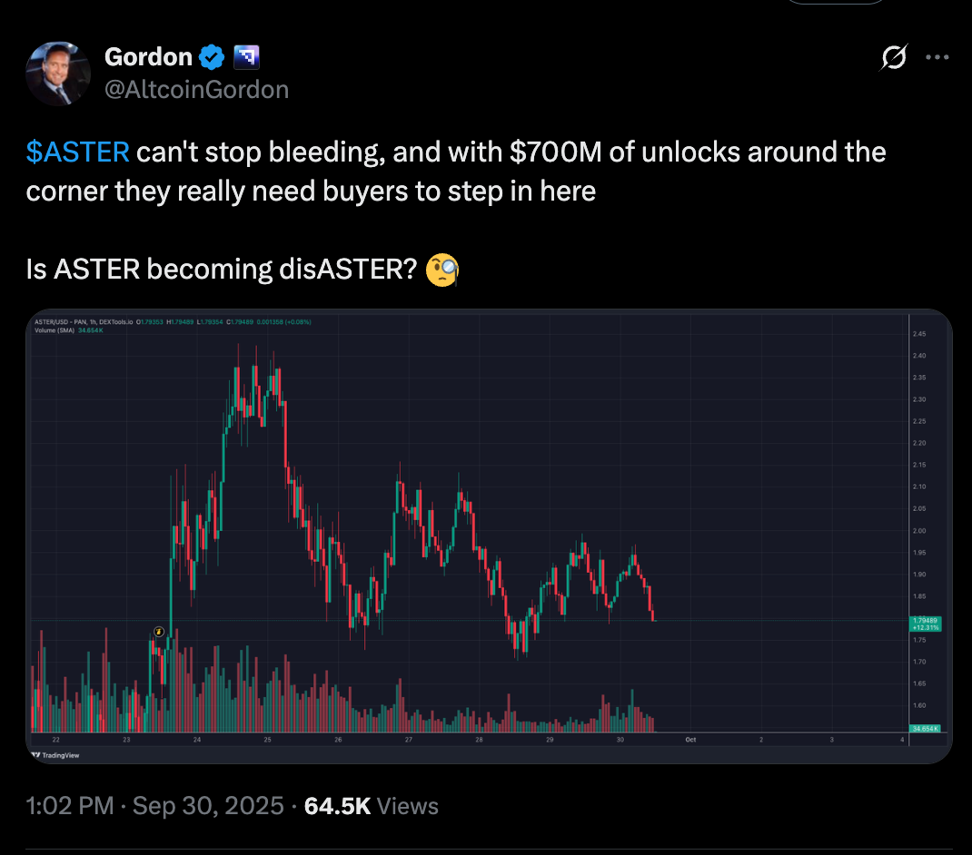 He points to the project’s tokenomics, noting that roughly $700 million worth of ASTER is set to unlock by year’s end, warning the token may “keep bleeding” as new supply hits the market.