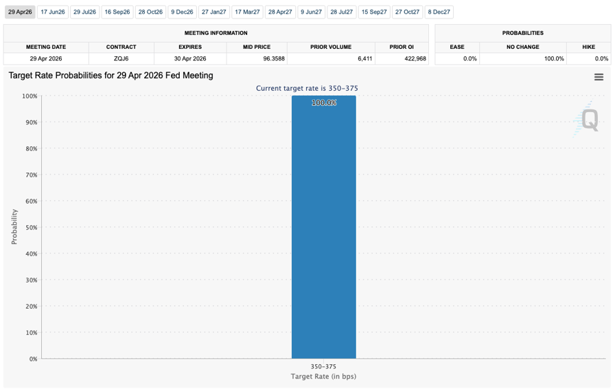Fed target rate probabilities for April 29 FOMC meeting (screenshot). Source: CME Group