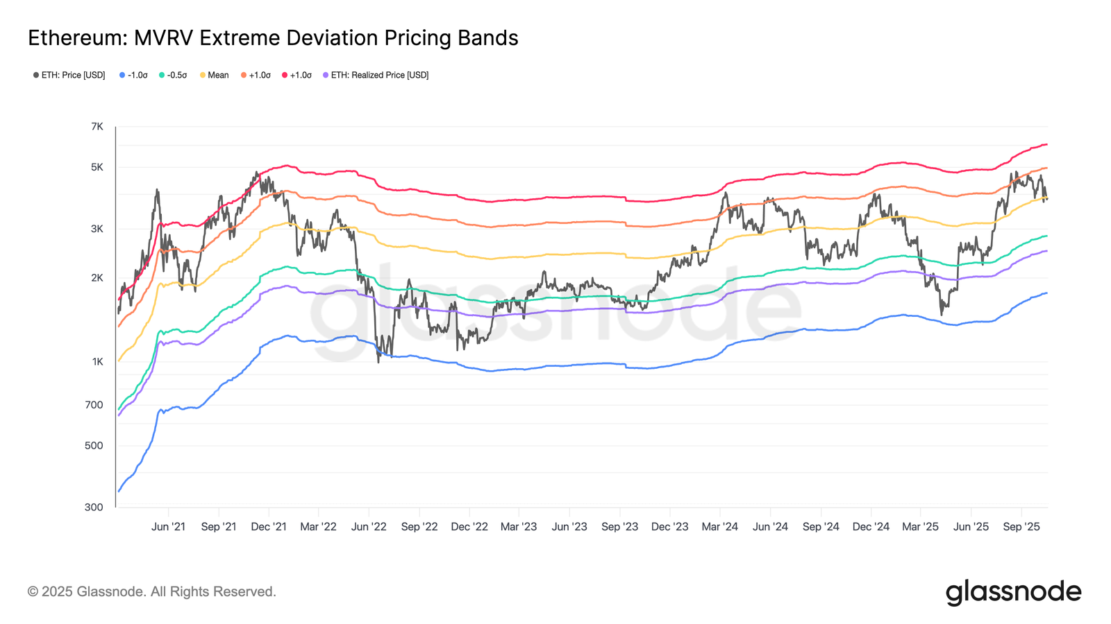 Ethereum’s MVRV Extreme Deviation Pricing Bands show that its recent pullback has been stabilizing near the mean band around $3,900, a level that has historically served as a springboard for new rallies.
