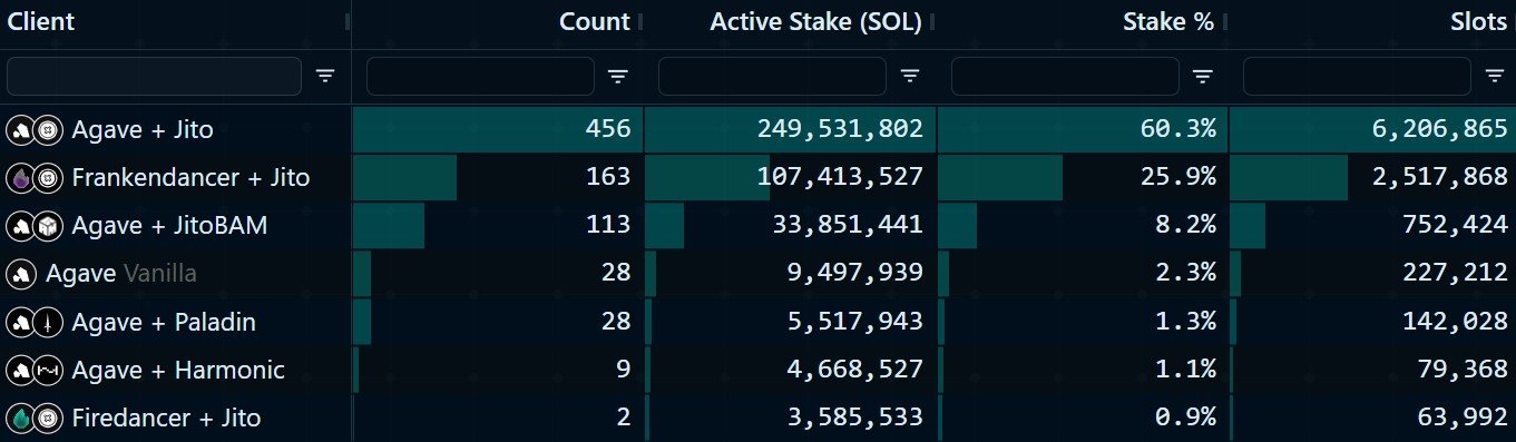 Two validators are currently running the full Firedancer client, but a hybrid version known as “Frankendancer” has seen far broader adoption. Data shows roughly 165 validators, representing about 26% of the total stake, are now running Frankendancer alongside the existing Agave client.