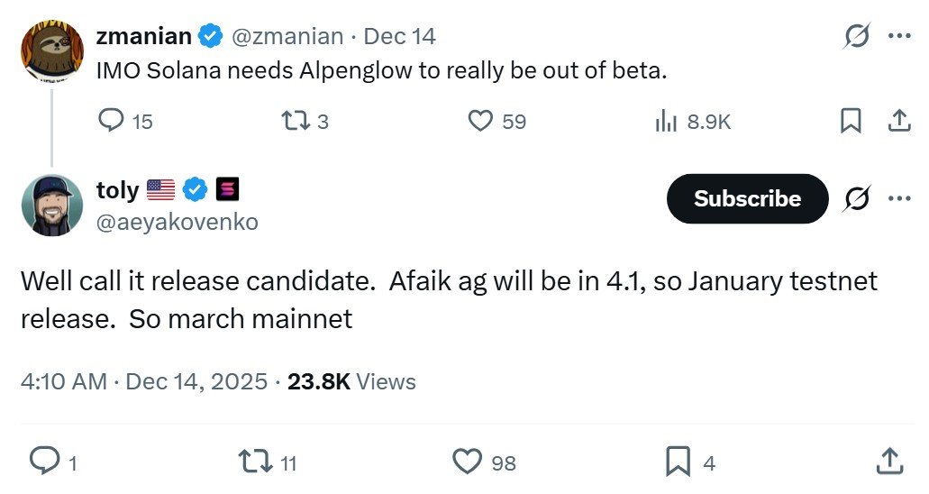 Alongside Firedancer, Solana developers are also preparing for Alpenglow, a proposed overhaul of Solana’s consensus design. The upgrade would replace proof-of-history and TowerBFT to cut block finality to roughly 150 milliseconds while improving the network’s ability to stay live even if a portion of validators are unresponsive.