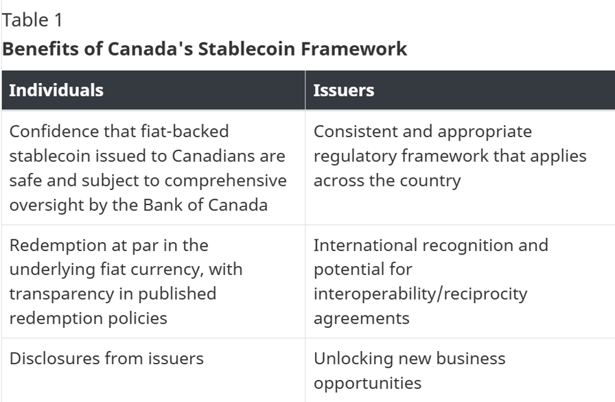 Canadian lawmakers have identified several potential benefits of a national stablecoin framework. Source: Government of Canada