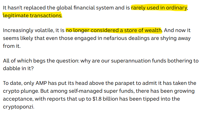 Other claims in the ABC article are that Bitcoin has never achieved any of its stated goals and has no practical purpose; it is rarely used in legitimate transactions and is no longer considered a reliable store of wealth.