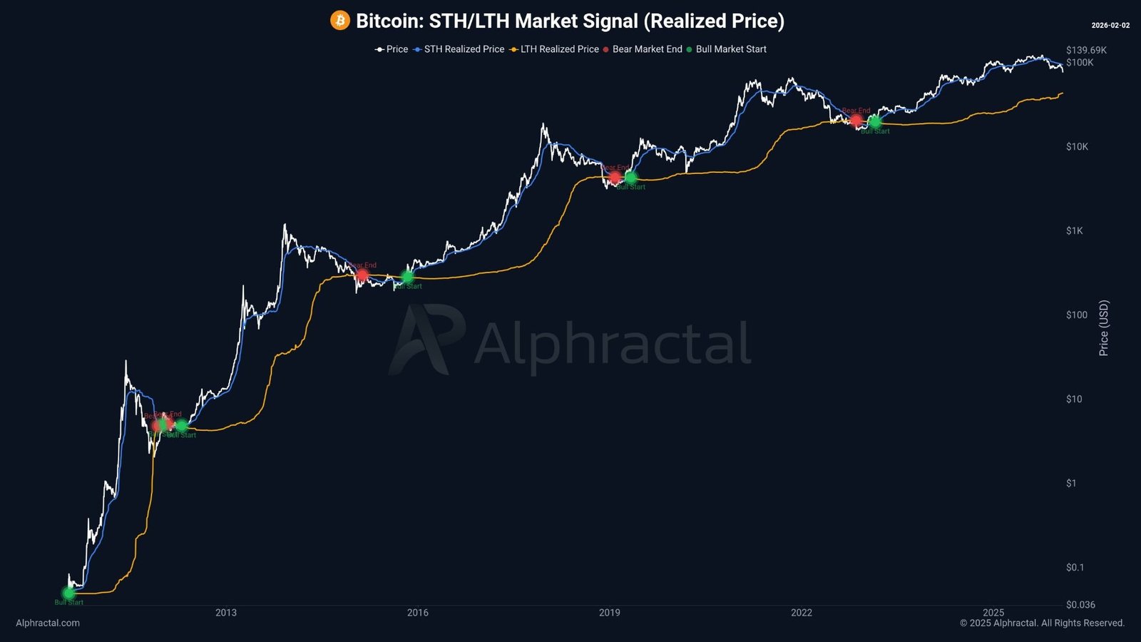 He added that bear markets only end when the STH realized price falls below the LTH realized price, and bull markets begin when it crosses back above.