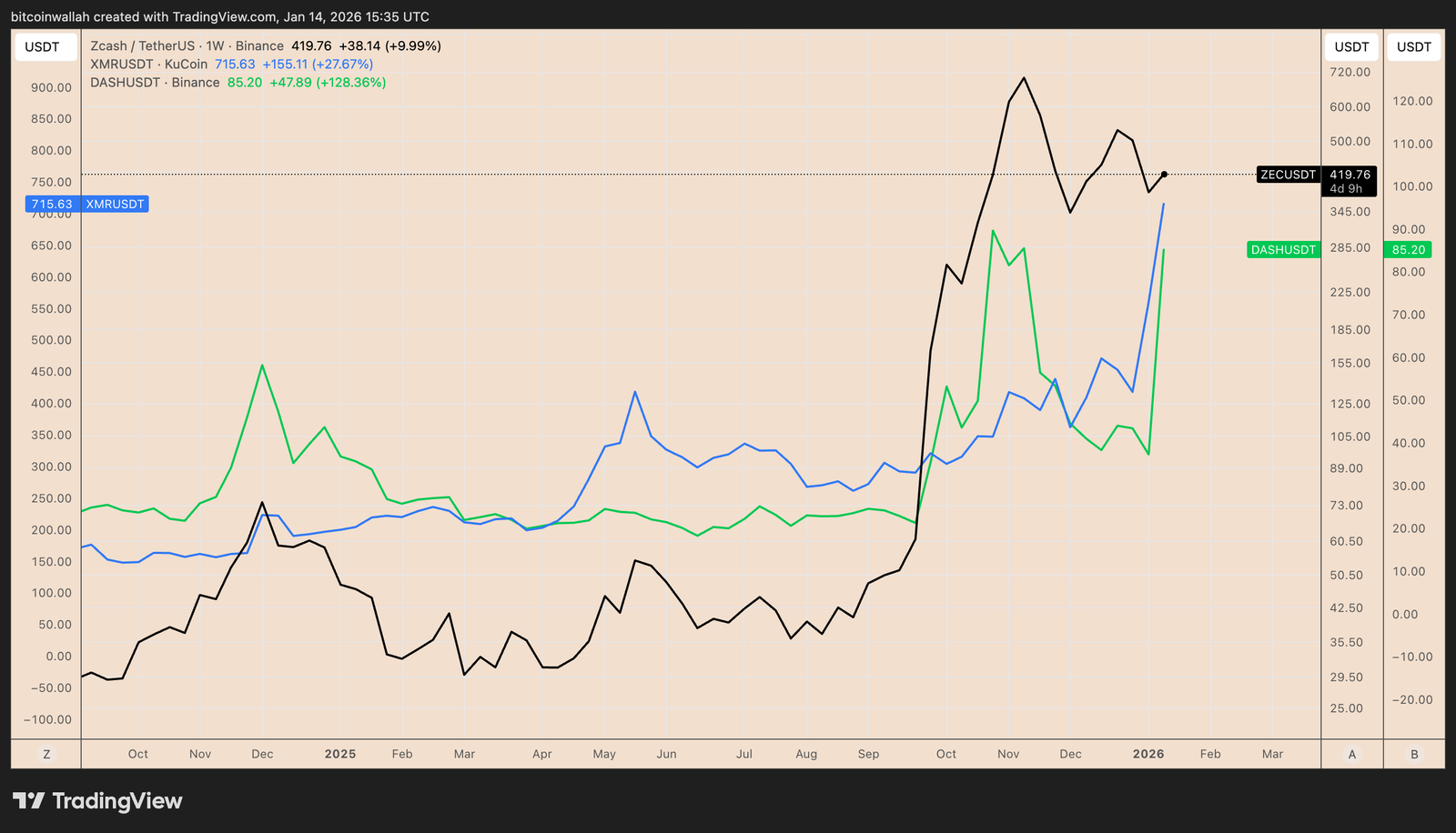 ZEC/USDT vs. XMR/USDT and DASH/USDT weekly performance chart. Source: TradingView