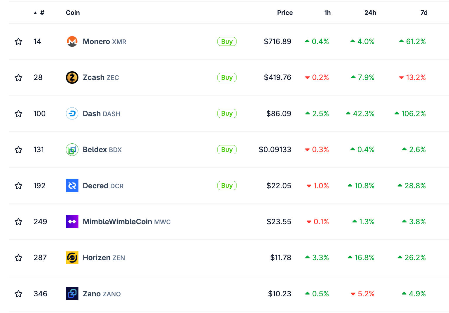 Top privacy coins and their hourly, daily, and weekly price performances. Source: CoinGecko