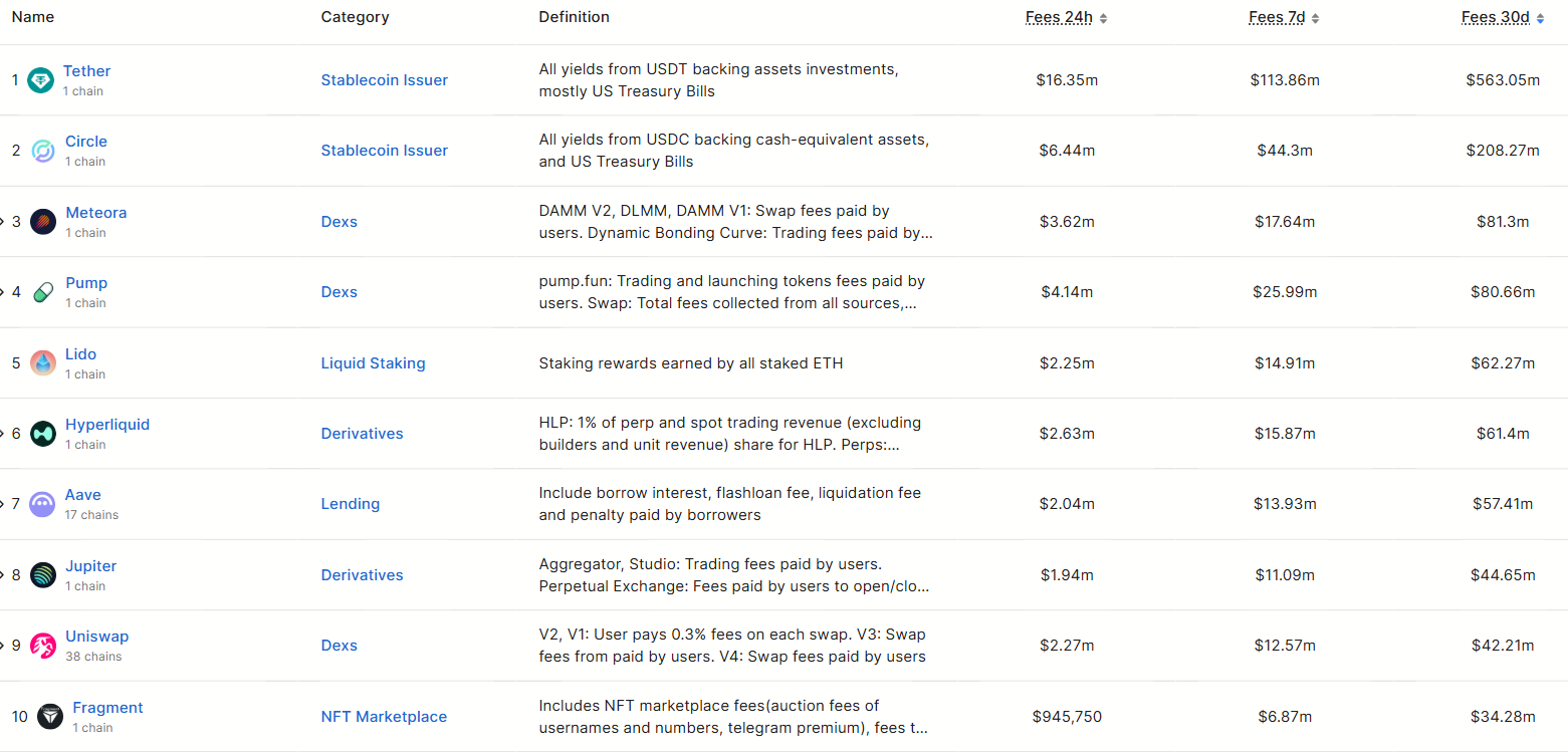 Data compiled by DeFiLlama shows that DeFi protocols now dominate the rankings of the highest-earning crypto products. The top 17 fee-generating entities over the past 30 days were applications or protocols rather than base-layer blockchains.