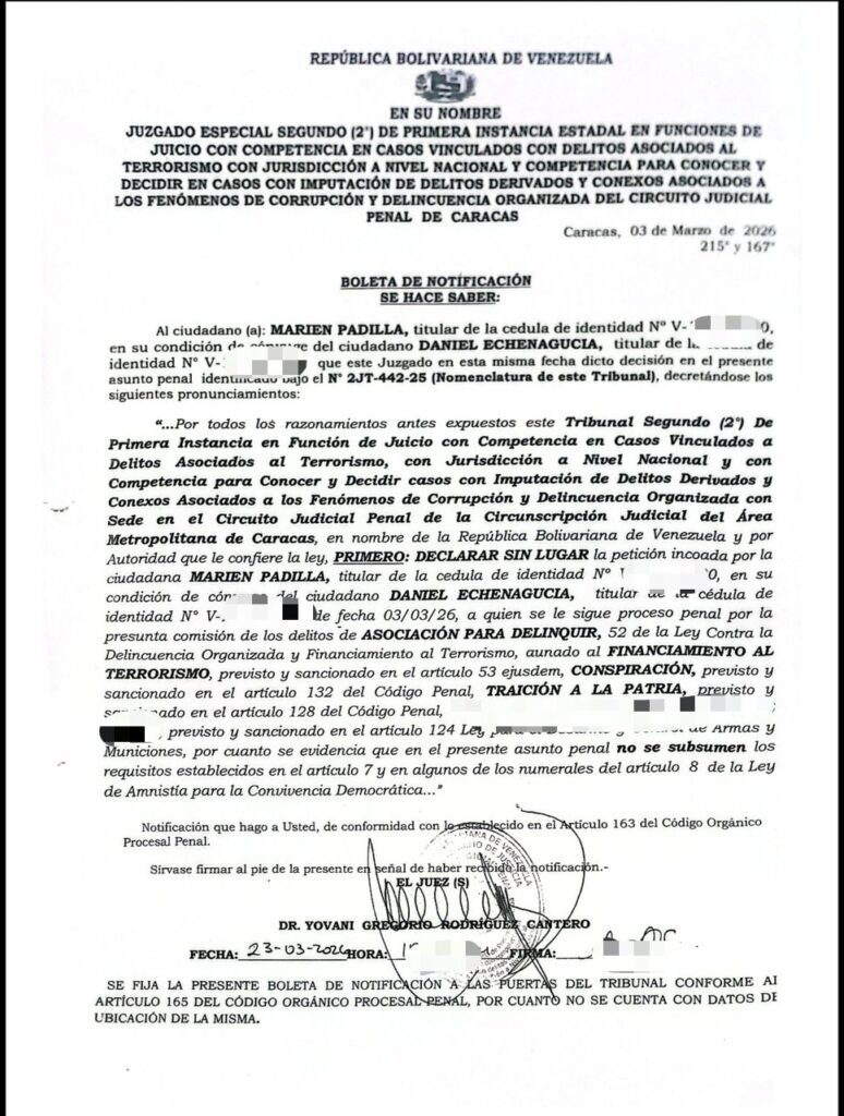 Echenagucia, an Italian-Venezuelan dual national, has been charged with terrorism, conspiracy, financing of terrorism, and criminal association. Padilla says her husband has lost roughly 60 pounds in prison, and though a release order was issued in January, he remains behind bars. Authorities recently denied his amnesty request, arguing that he was implicated in events from 2019. Padilla disputes that, claiming the family lived in the United States from 2018 to 2022 and was not in Venezuela at the time. Echenagucia’s mother is a U.S. citizen and has appealed directly to Trump and Rubio to secure her son’s release.*