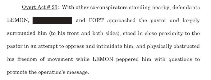 Courts have already ordered both Lemon and Fort released, though they’ll be back in court. In Lemon’s case, the judge refused to issue the requested $100k bond the government asked for. The court also will allow him to travel internationally on a pre-planned trip, even though the government demanded he hand over his passport. All of this seems clearly designed for blatant intimidation over media coverage.