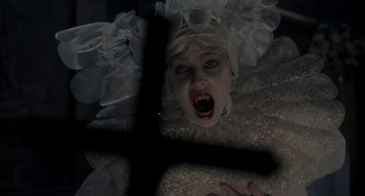 The Dracula who fits Besson’s description was created almost a century later by Francis Ford Coppola and his collaborators for the 1992 film Bram Stoker’s Dracula. Screenwriter James V. Hart built a new take on the story by introducing a prologue in which Vlad Ţepeş returns from battle to discover that his wife, Elisabeta, has killed herself upon receiving false news of his death. Because the Church condemns suicide, a priest informs Vlad that her soul is damned. He rebels against God in the chapel and desecrates the altar—acts for which he is cursed with vampiric immortality. Centuries later, he arrives in Victorian London and encounters Mina, who looks exactly like Elisabeta. Hart gave Dracula the line that convinced Gary Oldman to accept the role: “I have crossed oceans of time to find you.” The entire emotional architecture of Coppola’s film depended on this invention. Dracula, once a pure predator, now appears as a man who has turned monstrosity into a way of inhabiting grief, while Mina finds herself torn between her present fiancé and her past self.