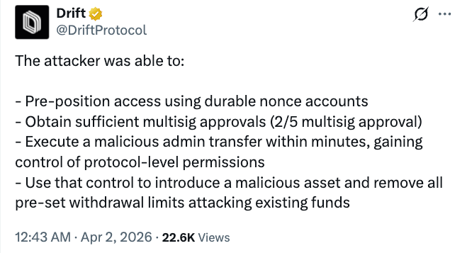 Drift said the attacker used durable nonce-based, pre-signed transactions to gain unauthorized administrative access and execute malicious actions quickly after submission.