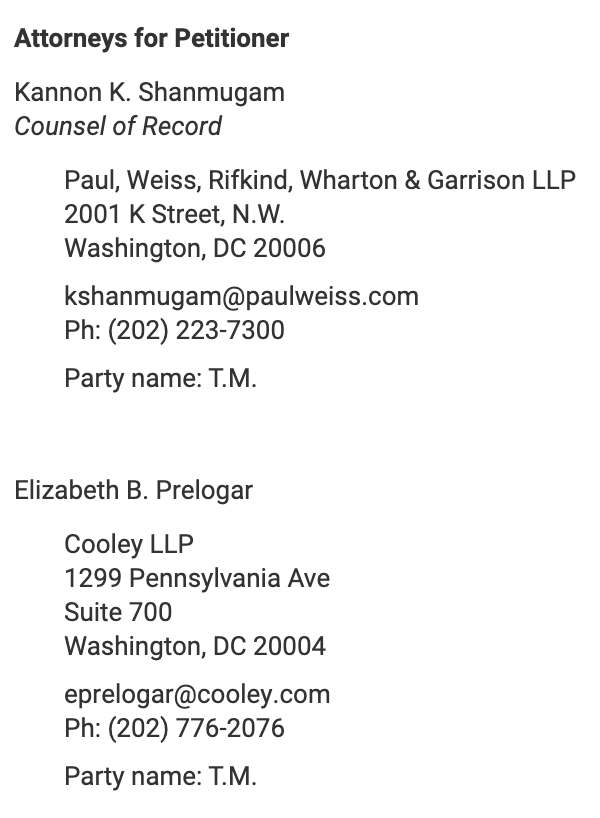 It is common enough for a veteran SCOTUS litigator to give a case to a fellow partner or an associate, to give them experience at the high court. It also happens that when two big SCOTUS firms are on a case, there is some process to decide which firm gets to argue. Sometimes the client chooses. When there is more than one client, it can get messy. When all else fails, a coin toss can resolve the conflict. But I can’t recall a situation like this: where a veteran SCOTUS litigator in a pro bono case files all of the cert-stage and merit-stage briefs, and then hands the case off to a SCOTUS litigator at another firm. Indeed, the fact that this case is pro bono is significant. There was only one client, who is a person, rather than a institution. I don’t think there was a General Counsel department advising T.M. about who would be the best attorney to argue the case. Here, Shanmugam was on the cert petition, so he has had the case for some time.