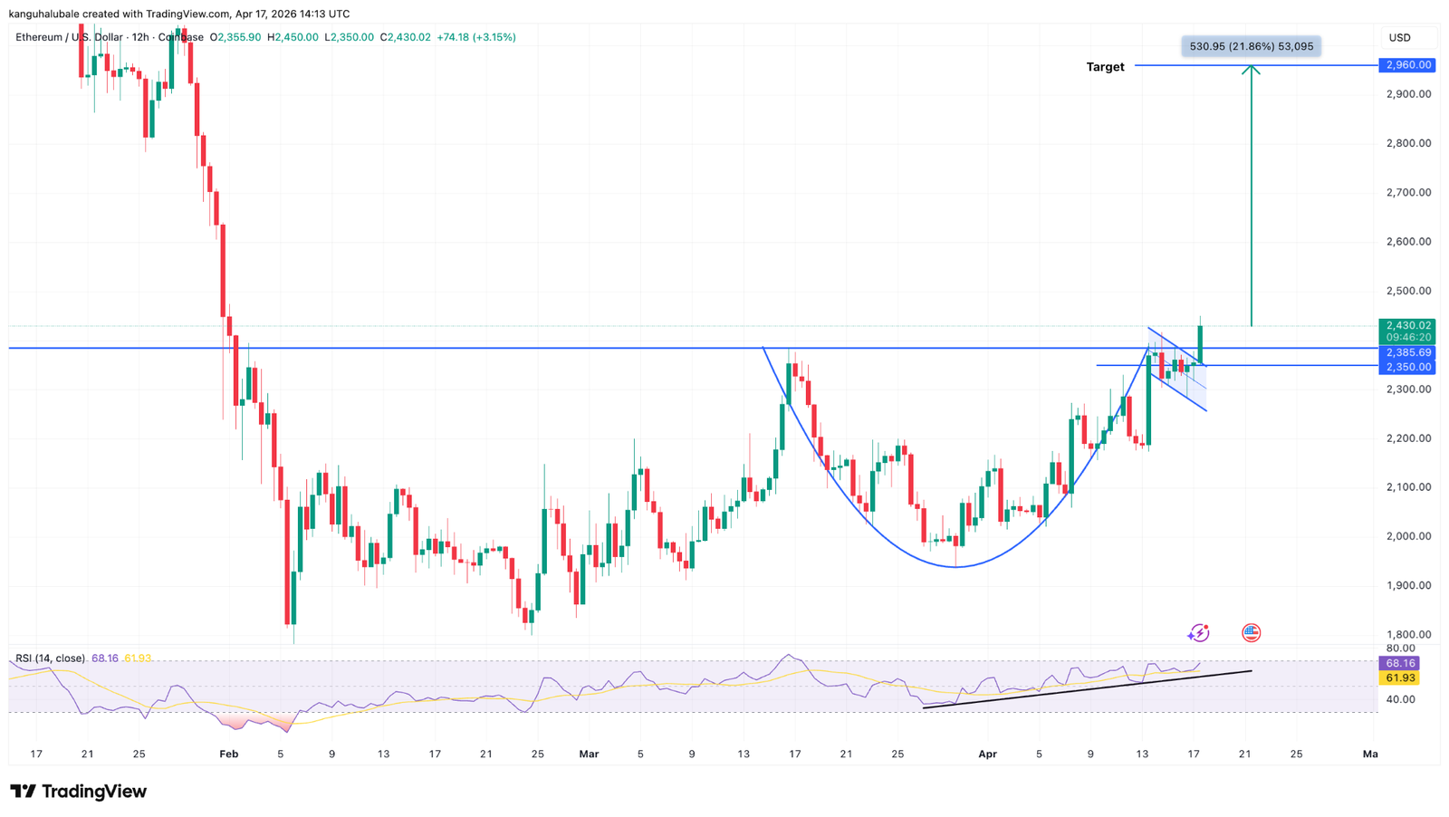The ETH/USD pair may resume its prevailing bullish trend after breaking out of a cup-and-handle (C&H) chart pattern, as shown in the chart below. A 12-hour candlestick close above the cup’s neckline at $2,400 may signal the start of a stronger uptrend.