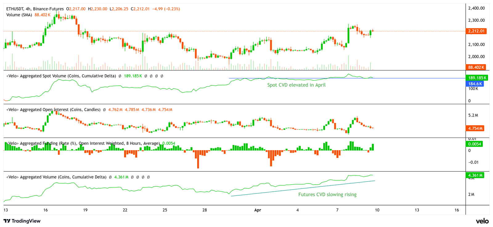 Charts show ETH market structure improving and the current volumes being largely spot market driven. On the four-hour chart, ETH maintains higher lows while attempting to break into the $2,250–$2,300 range.
