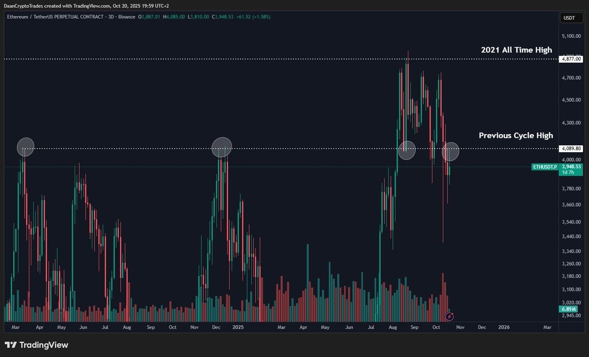 Popular analyst Jelle said that Ether is just retesting a key breakout level around $4,000 before resuming its uptrend.