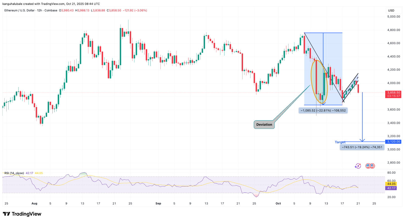 The measured target from the flagpole’s height comes to be around $3,120, an approximately 20% drop from the current price.