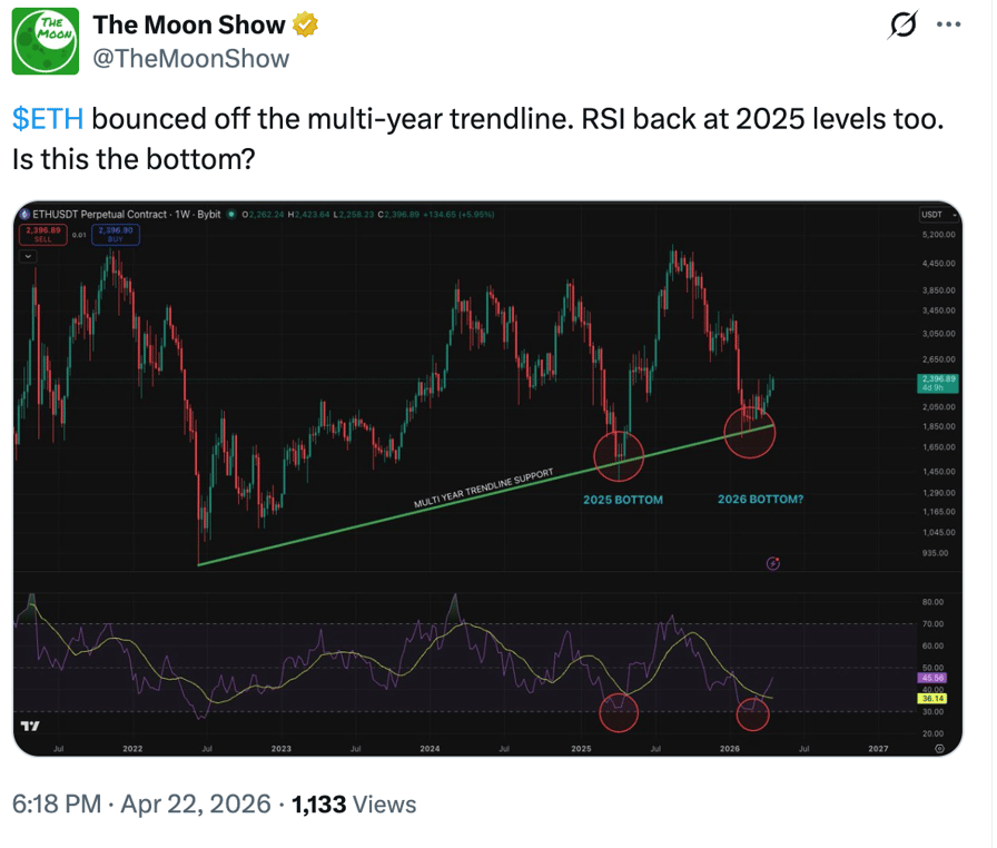 Ether is currently bouncing off a multi-year trend line that has historically marked macro ETH price bottoms. Previous instances in April 2025 and mid-2022 resulted in 260% and 130% ETH price rallies, respectively.
