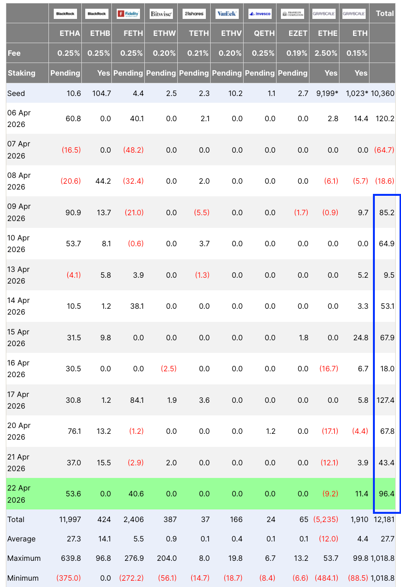 Spot Ethereum ETF flows table. Source: SoSoValue