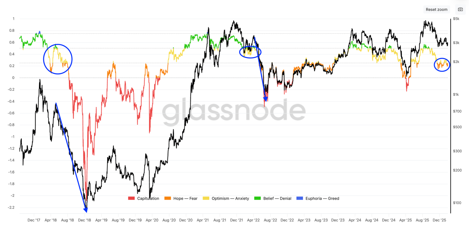 In previous market cycles, the transition to fear has accompanied extended price drawdowns, as shown in the chart below.