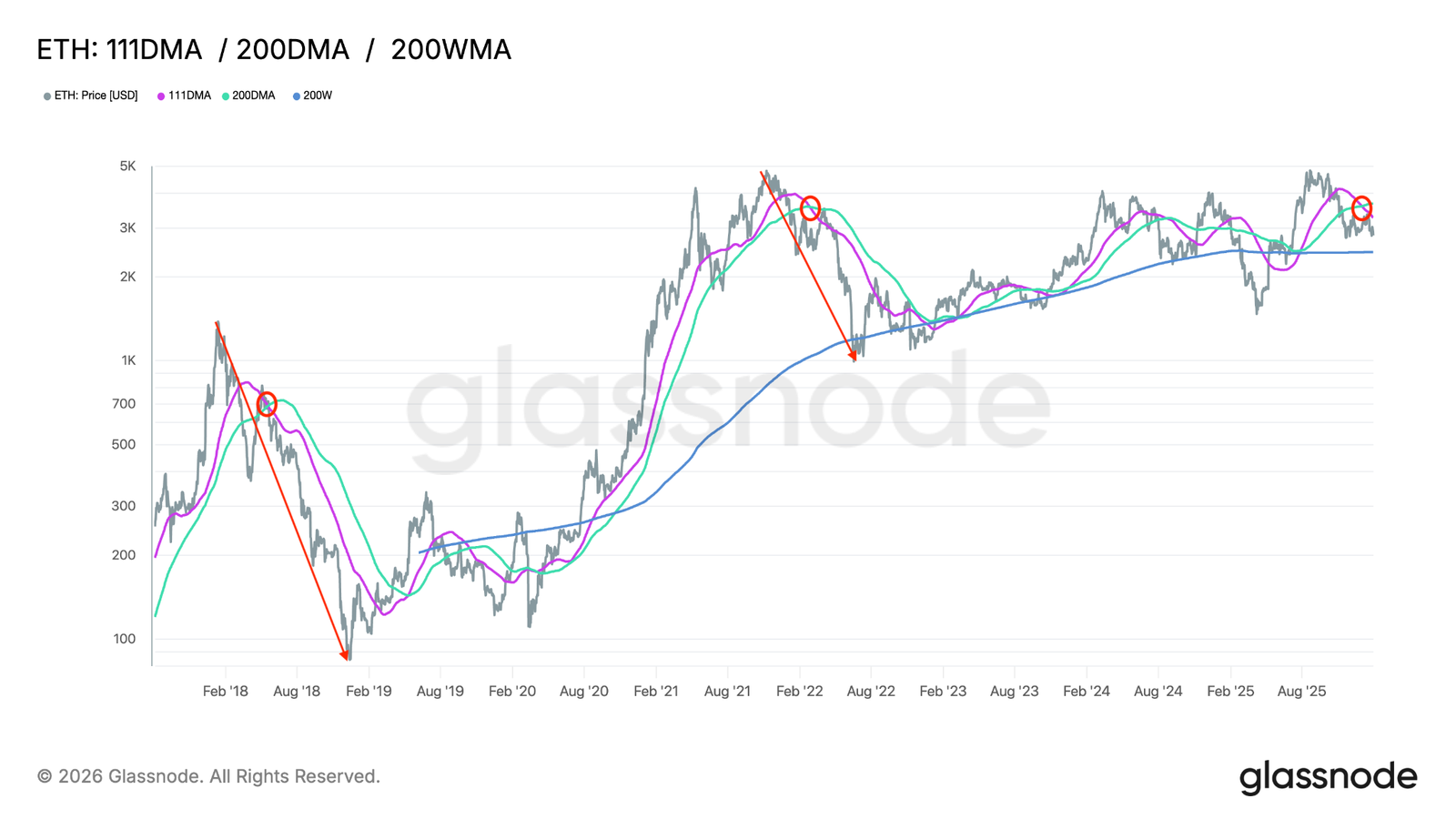 Ether’s 111-day MA vs. 200-day MA. Source: Glassnode
