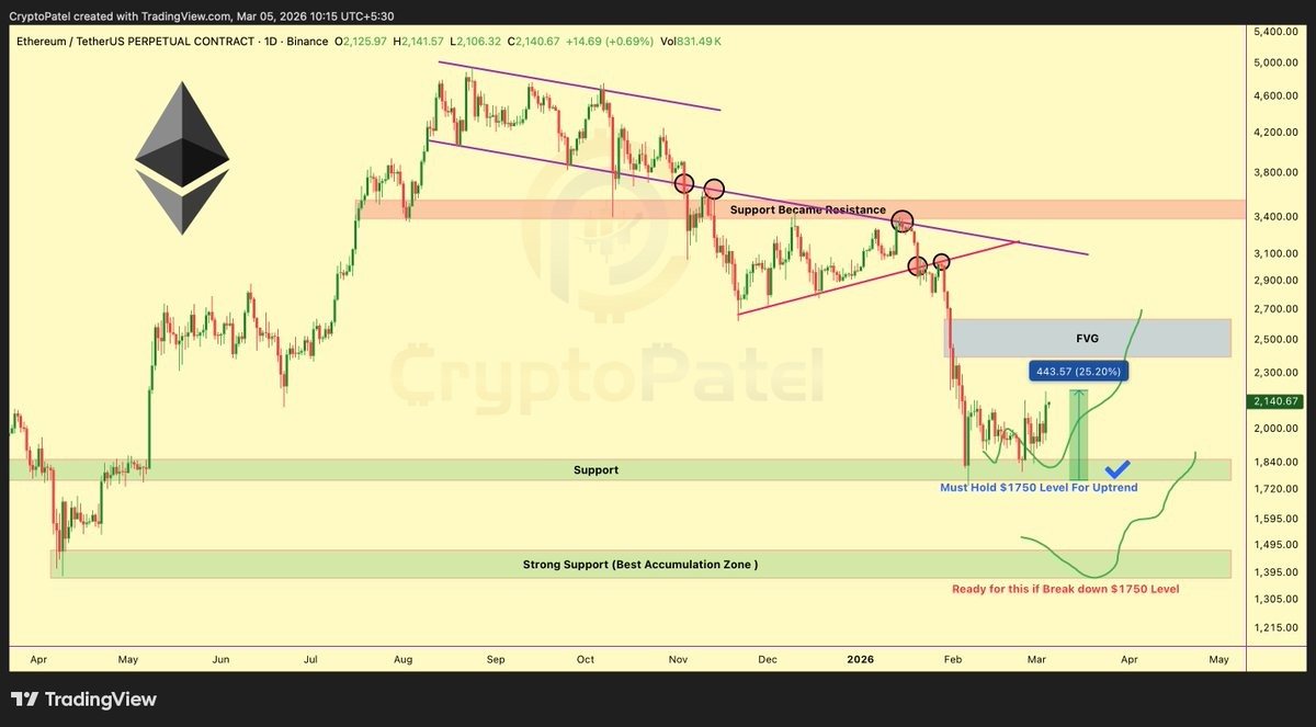 Trader and analyst Crypto Patel said that the $1,750 support must hold for “bulls to stay in control,” with the upside target set at “$2,500-$2,600.