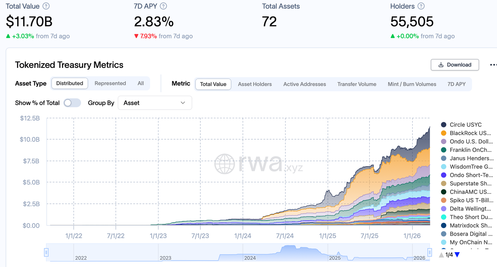 Products from companies including BlackRock, Franklin Templeton and Circle account for a significant share of the market, with Circle’s USYC holding about $2.3 billion, BlackRock’s BUIDL fund around $2 billion and Franklin Templeton’s onchain fund over $1 billion in assets.