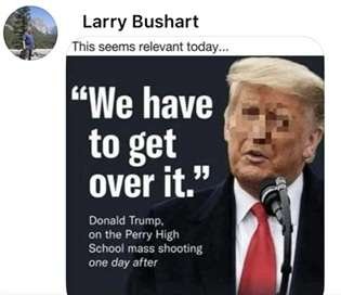 Ten days after Kirk’s death, Larry Bushart—a 61-year-old retired law enforcement officer and a resident of Lexington, Tennessee—noticed a Facebook post promoting a candlelight vigil in nearby Perry County. Underneath it, he posted a series of political memes, the internet’s version of political cartoons. One image (the “Meme”) accurately quoted a statement President Donald Trump made after a January 2024 shooting at Perry High School in Perry, Iowa: