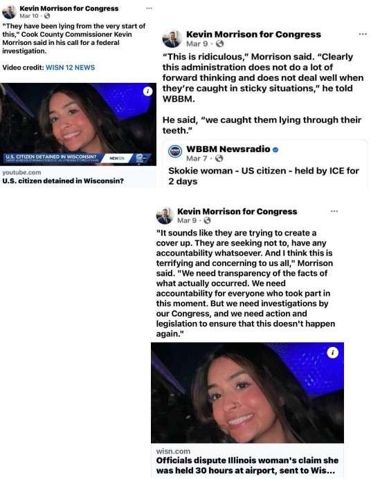 On or about, March 8, 2026, Cook County Commissioner Kevin Morrison, then a candidate for the United States Congress, stated during a press conference that Naqvi and five other individuals were transported from Illinois to Wisconsin by immigration agents. During this press conference Commissioner Morrison made allegations of an illegal detention of a U.S. citizen by government officials, including Sheriff Schmidt.