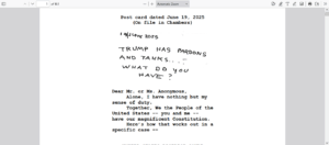 Judge Young’s opinion includes a number of rhetorical flourishes that some might consider inappropriate for a judicial ruling. For example, the beginning and end are framed as a response to an anonymous postcard sent to the court: