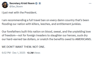 The ruling then includes a screenshot of Noem’s X post declaring “WE DON’T WANT THEM. NOT ONE. THEY ARE ALL KILLERS, LEECHES, AND ENTITLEMENT JUNKIES. WE DONT WANT THEM HERE.”