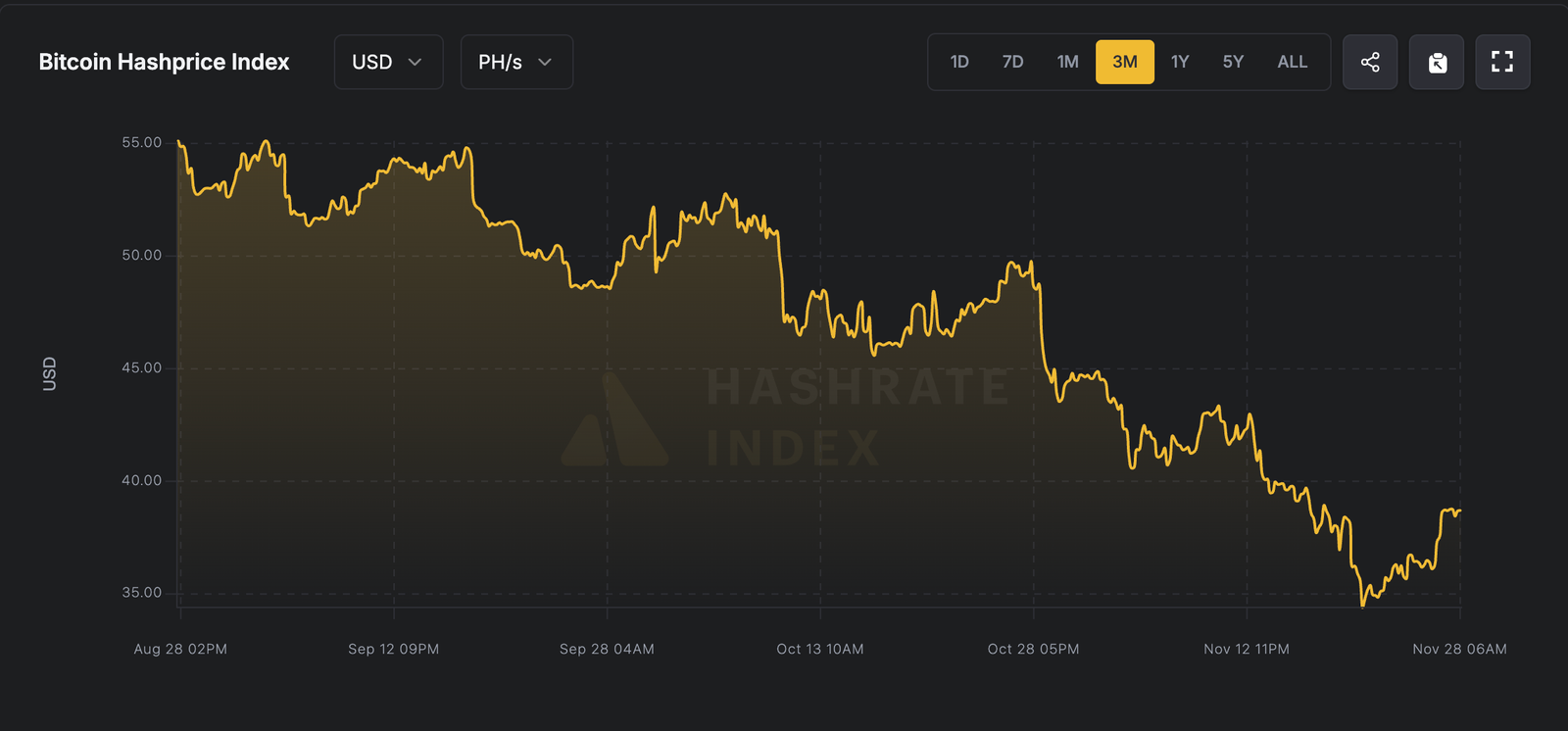 Hashprice, a critical metric for miner profitability that measures expected profits per unit of computing power, dropped to about $35 petahashes per second (PH/s) in November as BTC plunged to lows of about $80,000.