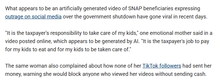 Fox News fell for it completely. And when called out, rather than acknowledge the error with a proper correction, they simply rewrote the article at the same URL, keeping the same timestamp, but now pretending it was a story that AI videos of fake SNAP beneficiaries had “gone viral.”