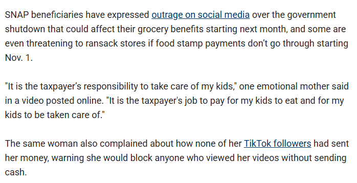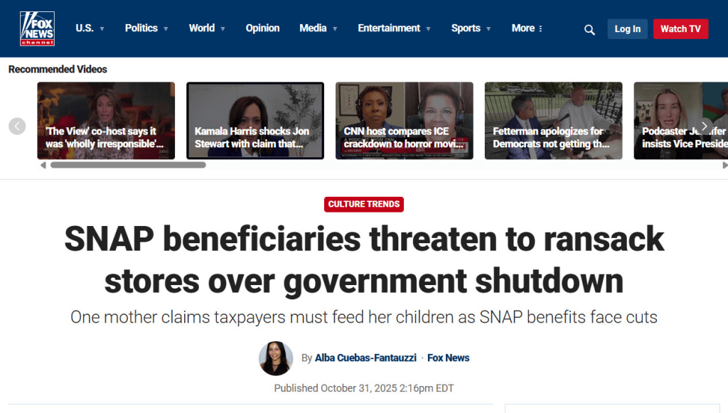 On Friday, “production assistant” Alba Cuebas-Fantauzzi at Fox News Digital, who seems to specialize in publishing culture war nonsense, took things to another level, publishing an article claiming that “SNAP beneficiaries threaten to ransack stores over government shutdown.”